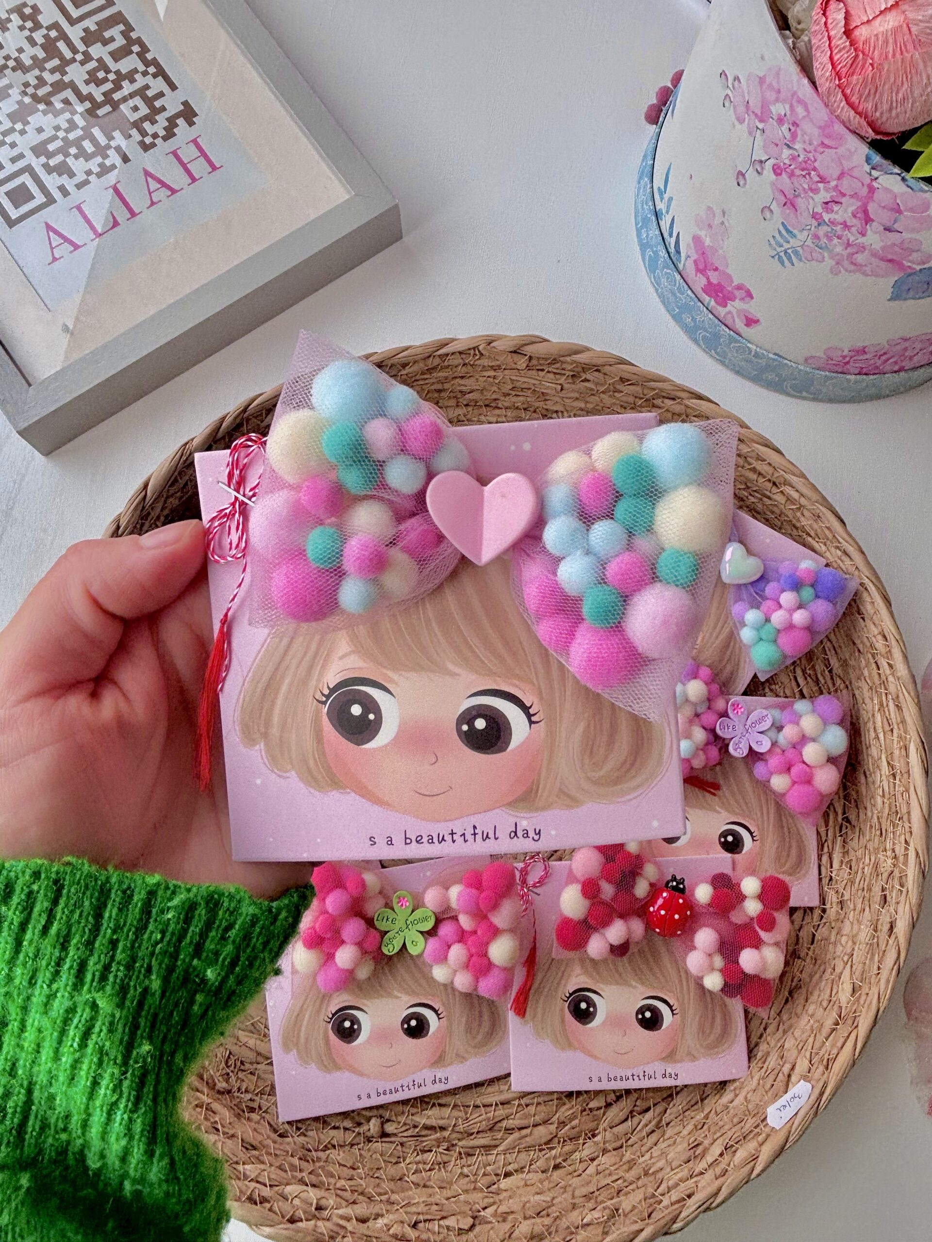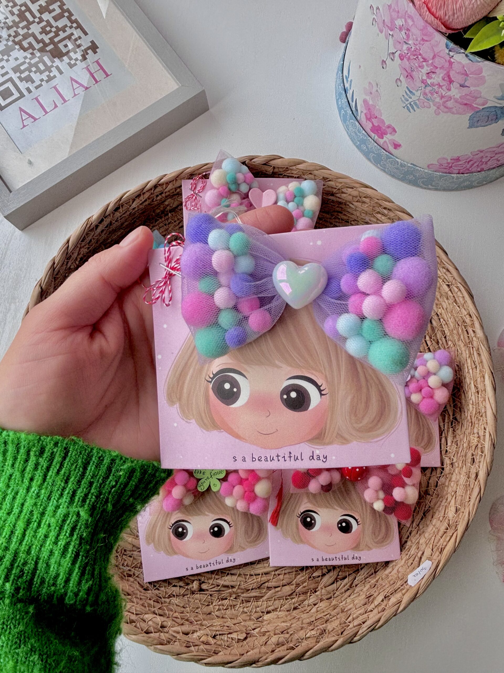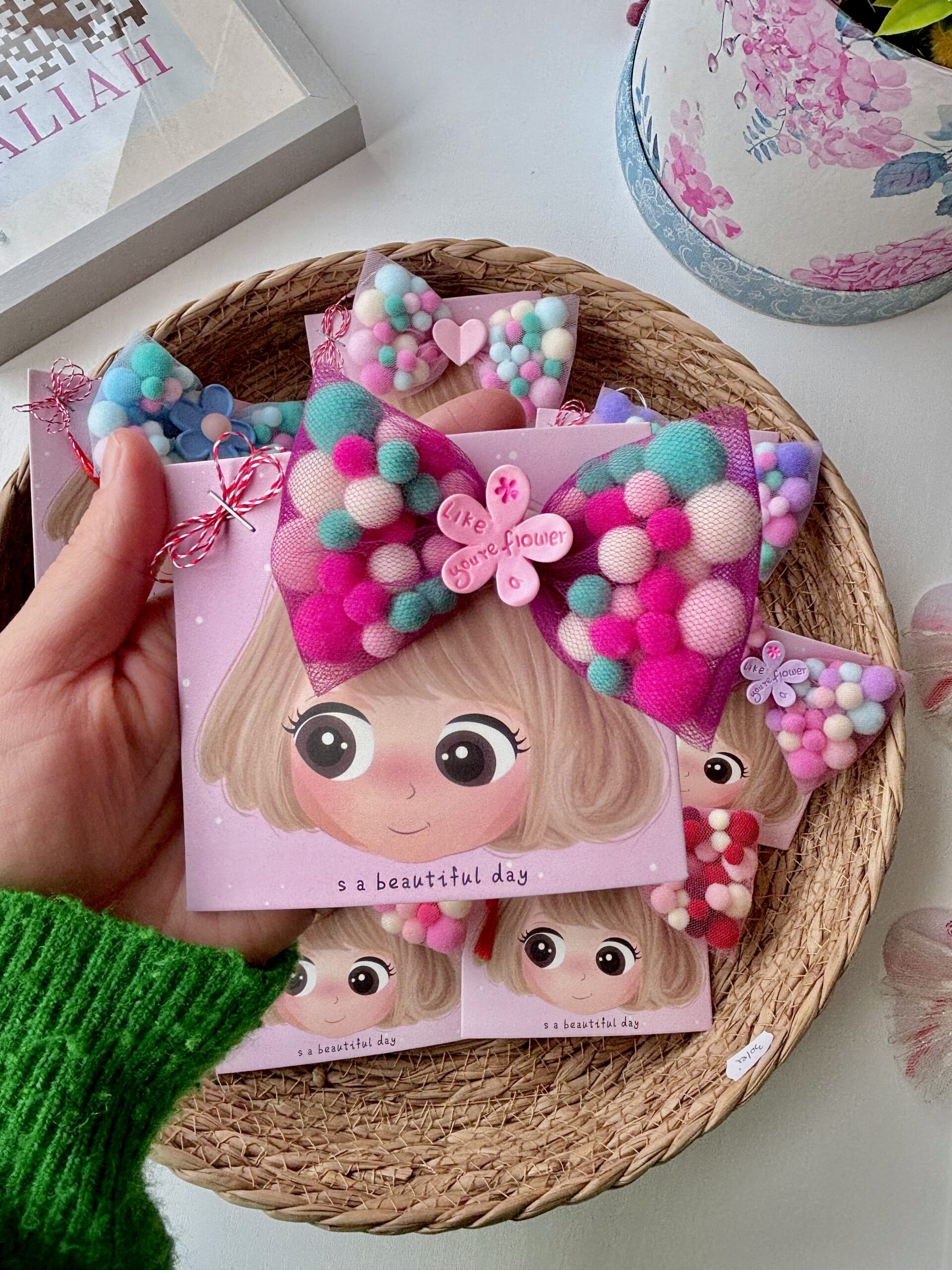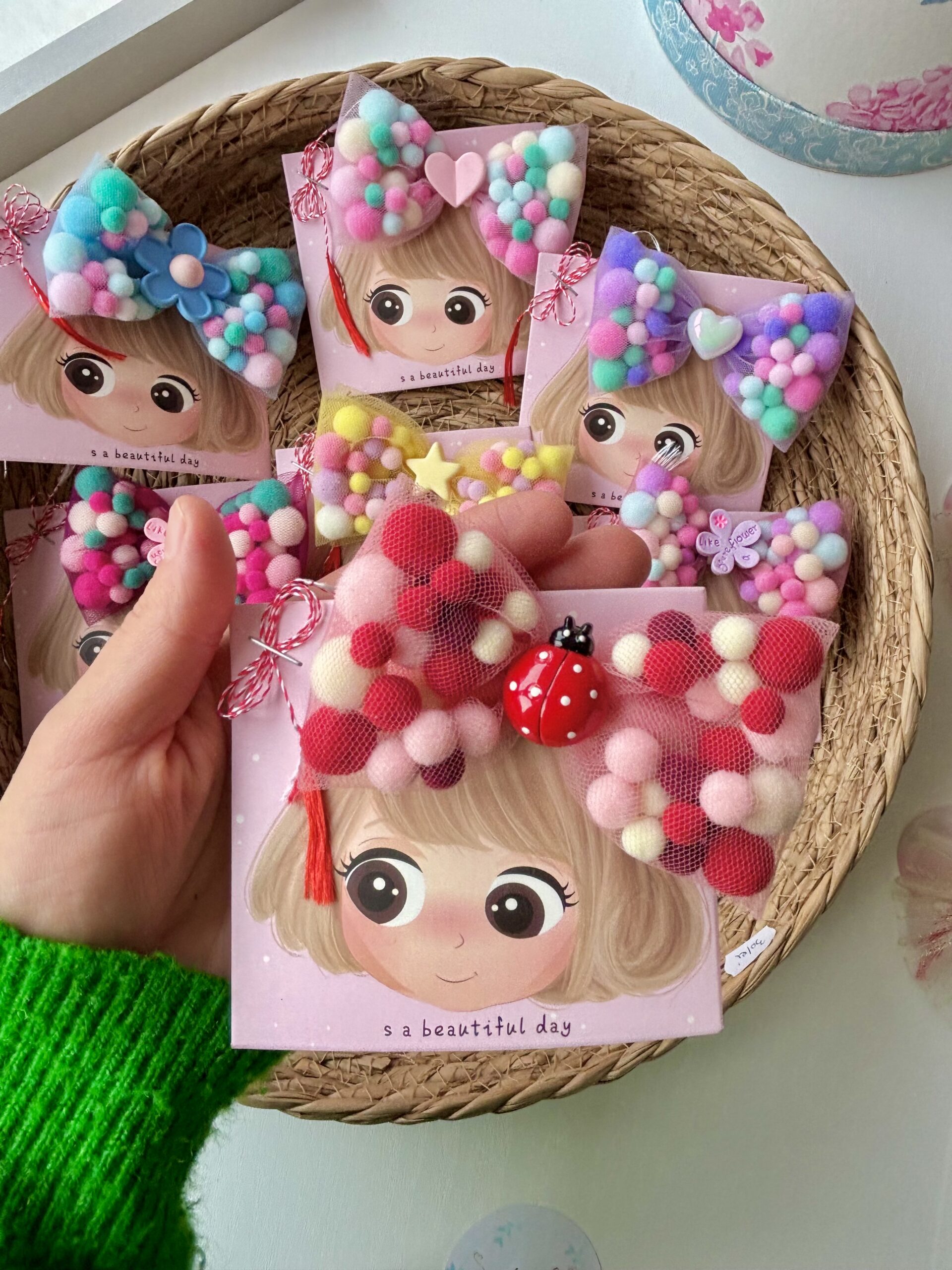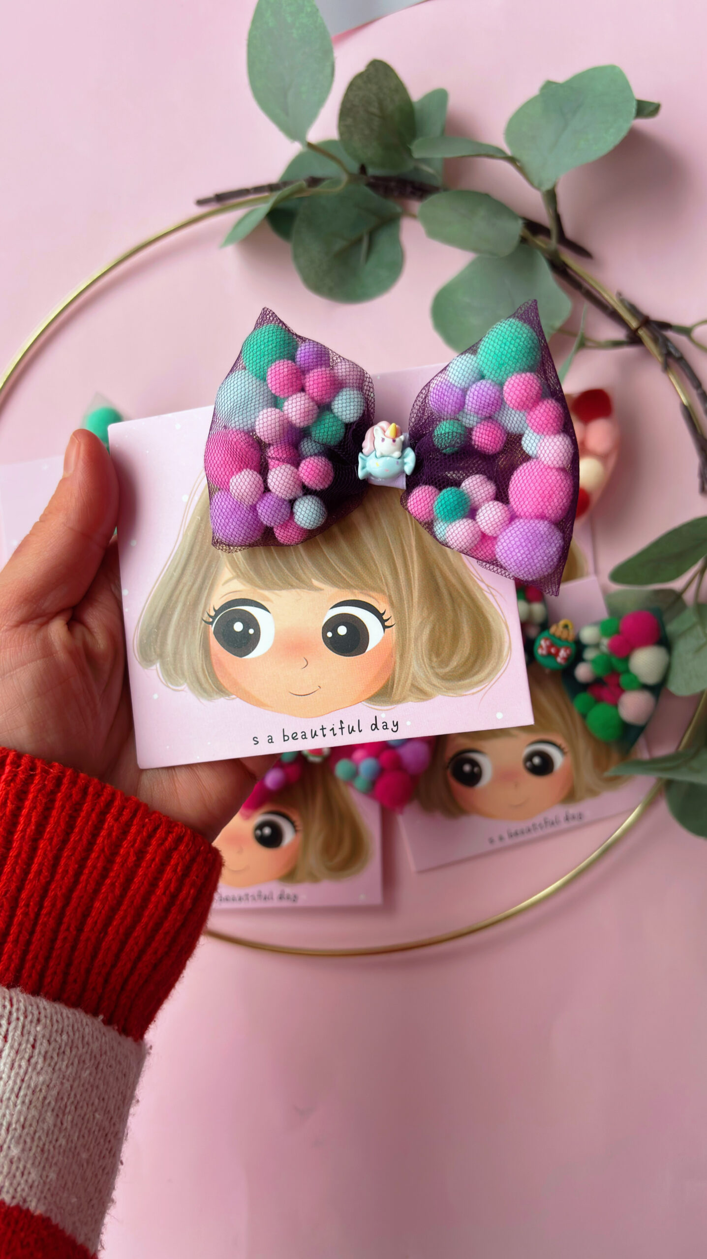 Adaugă un strop de culoare și veselie coafurii celei mici (sau chiar ție!) cu această clamă adorabilă cu fundă din pompoane! Realizată manual cu grijă, fundița este formată din pompoane moi, pufoase și viu colorate, oferind un look vesel și original, perfect pentru zile de naștere, petreceri sau orice moment în care vrei să ieși în evidență.