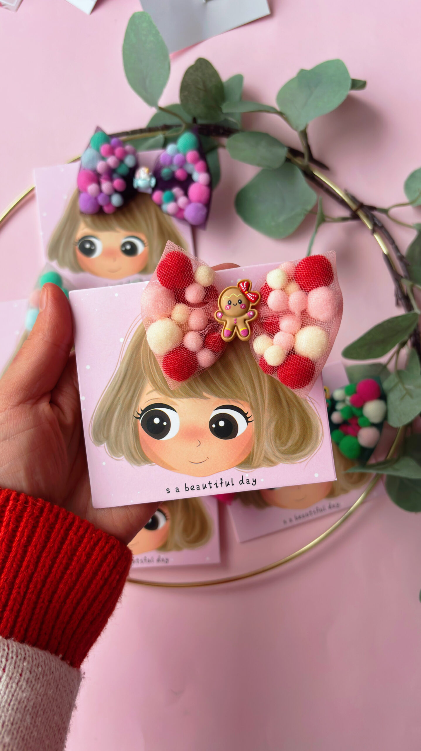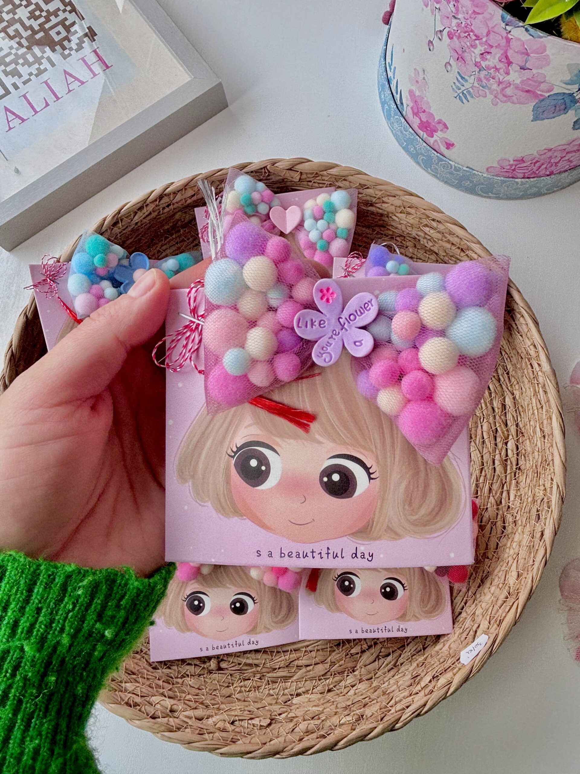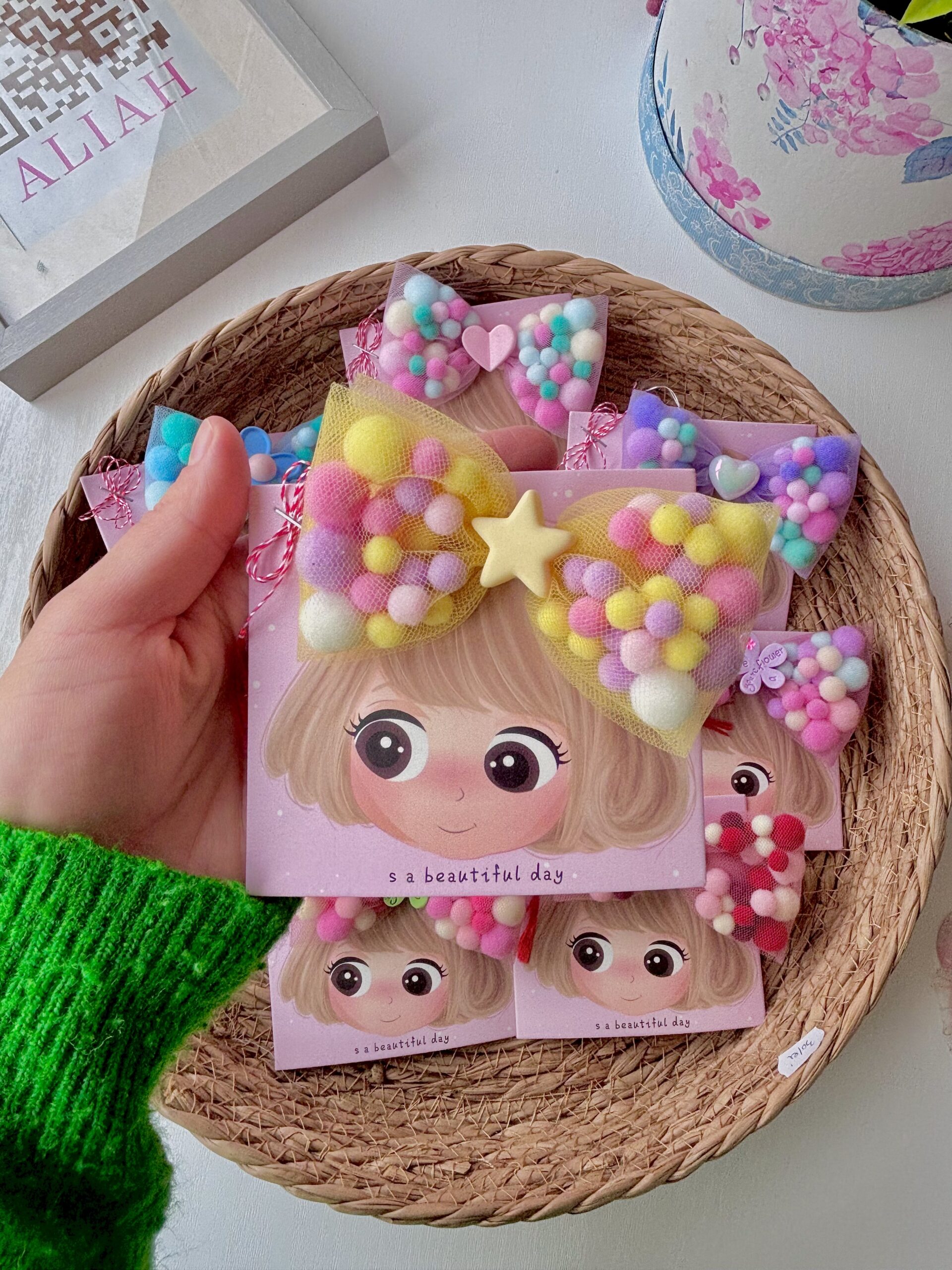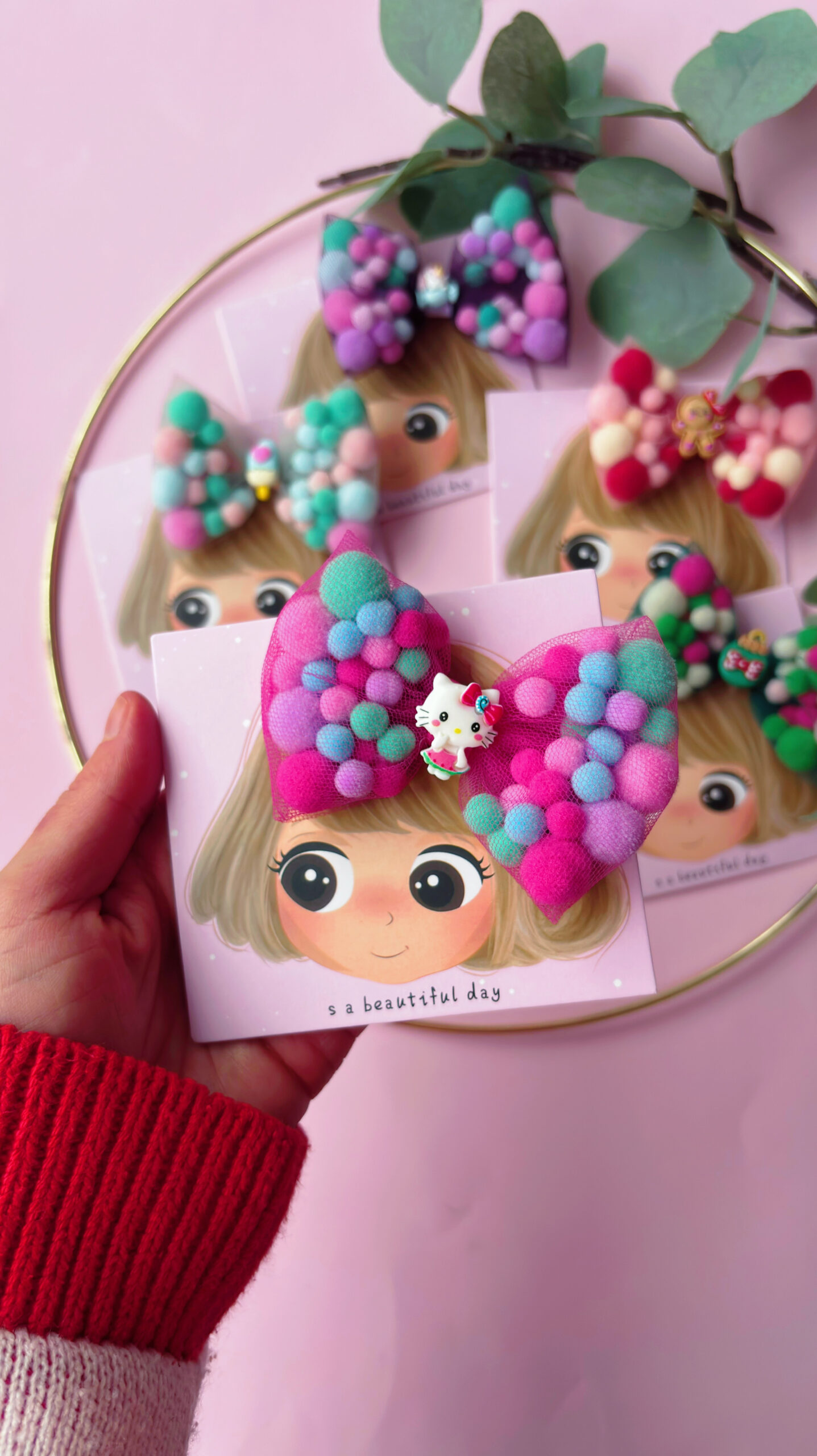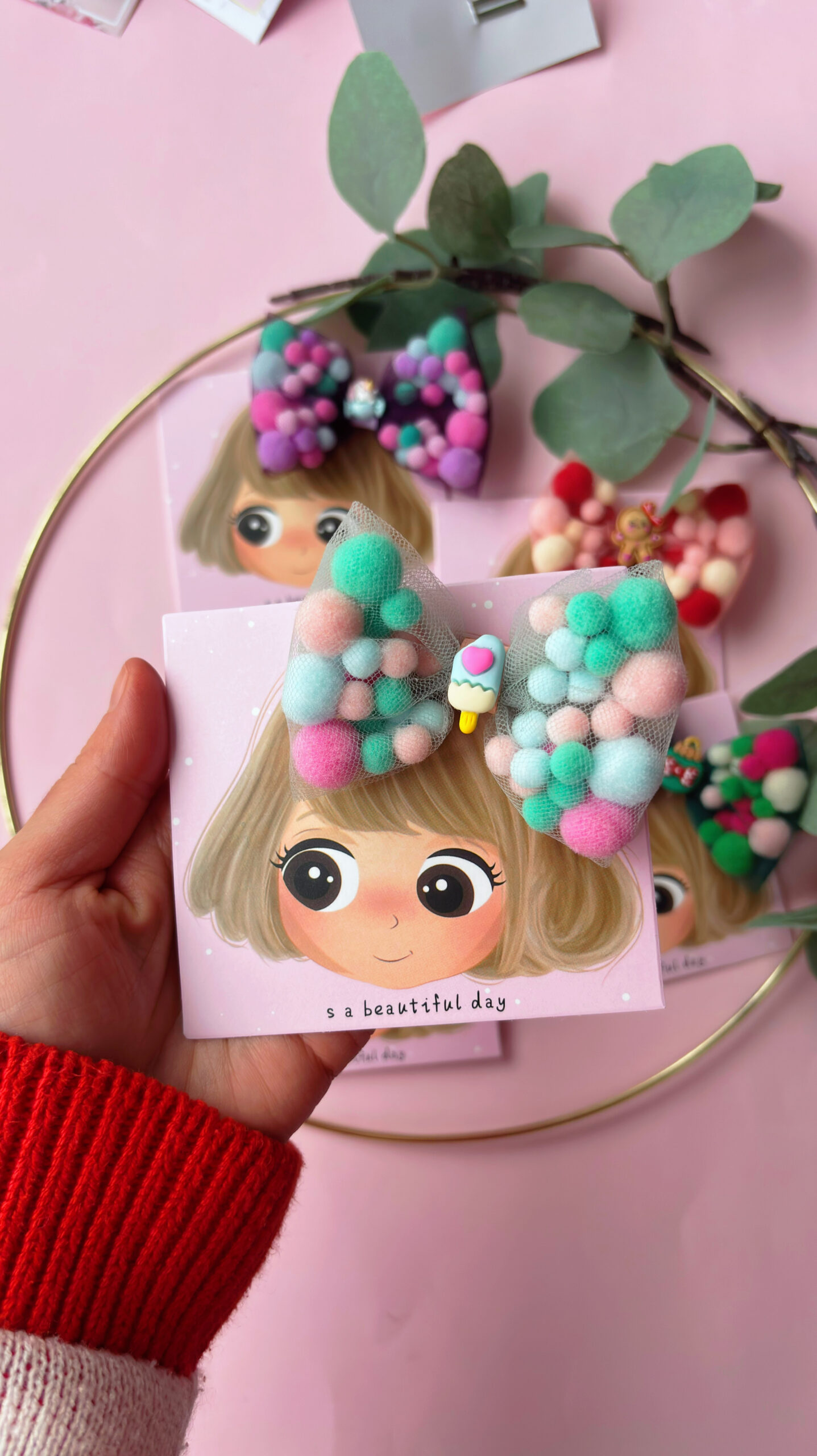 Adaugă un strop de culoare și veselie coafurii celei mici (sau chiar ție!) cu această clamă adorabilă cu fundă din pompoane! Realizată manual cu grijă, fundița este formată din pompoane moi, pufoase și viu colorate, oferind un look vesel și original, perfect pentru zile de naștere, petreceri sau orice moment în care vrei să ieși în evidență.