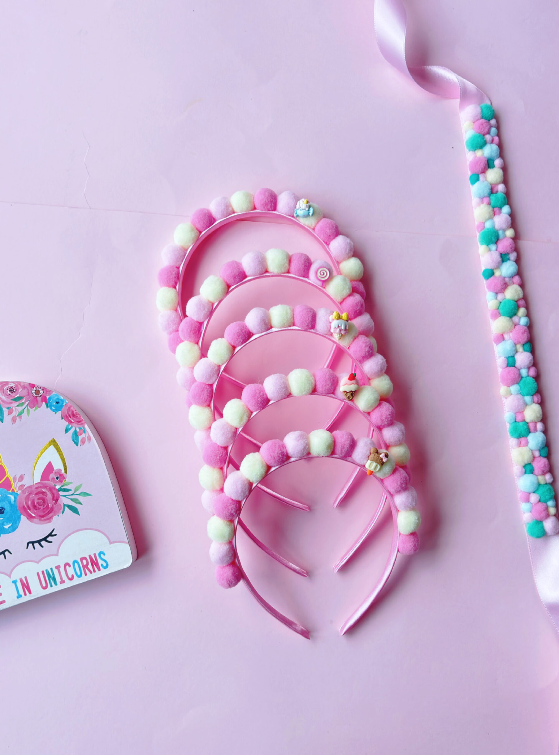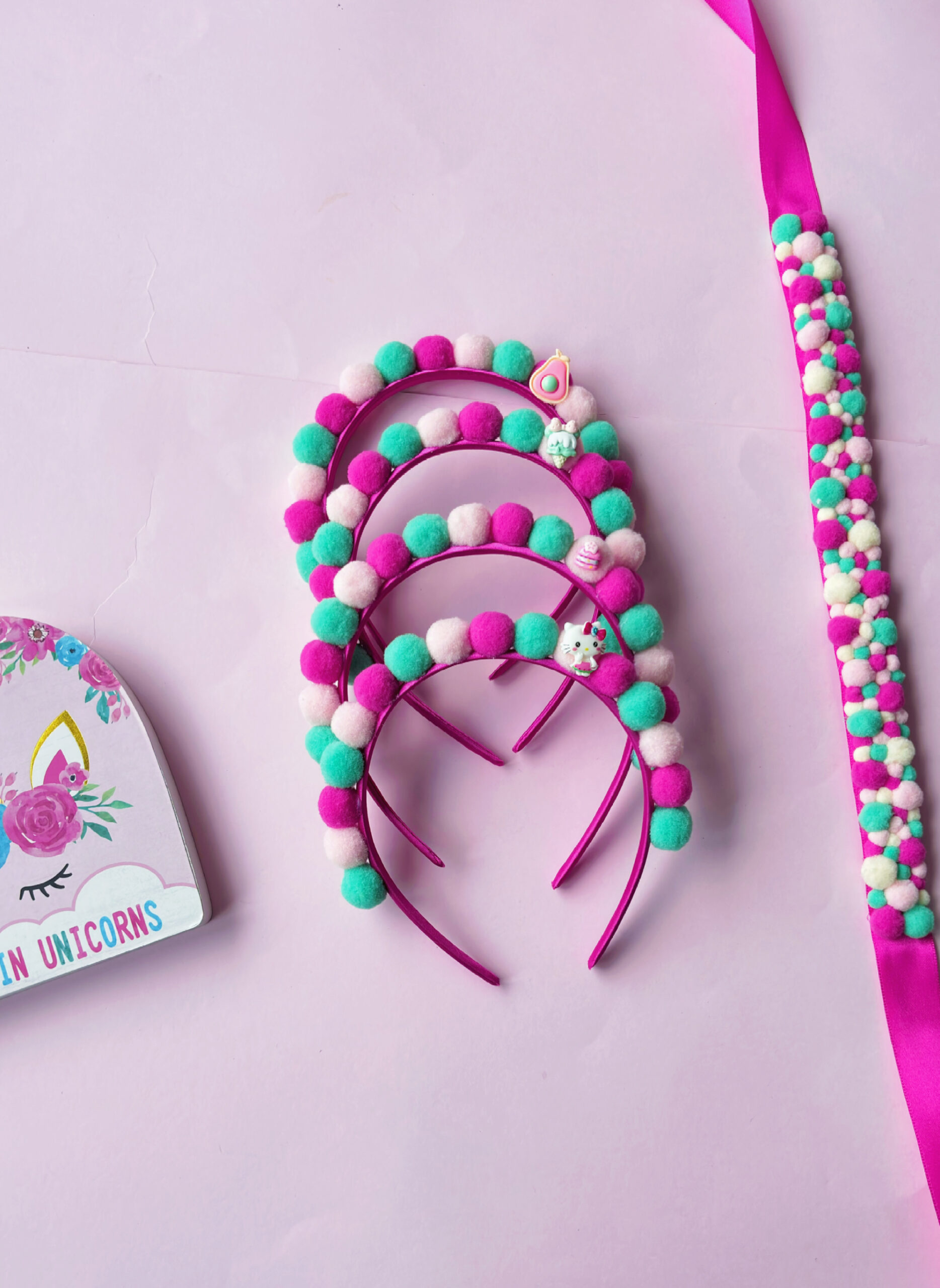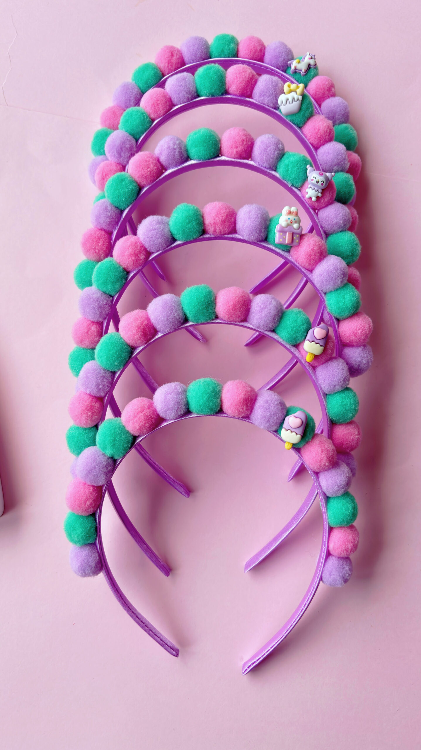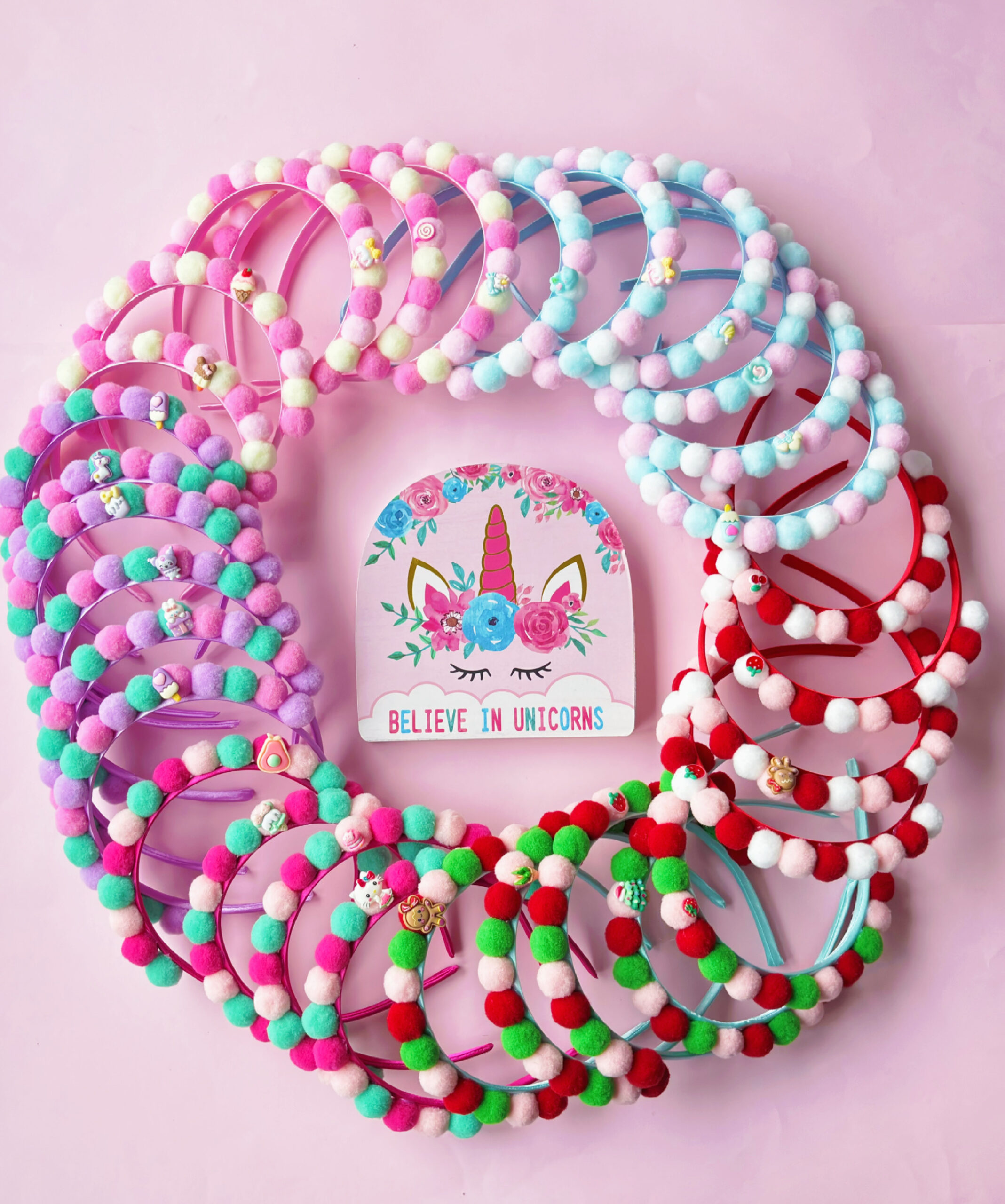 Adaugă un strop de culoare și magie ținutelor celor mici cu această coroniță adorabilă cu pompoane mari, în 6 nuanțe jucăușe!